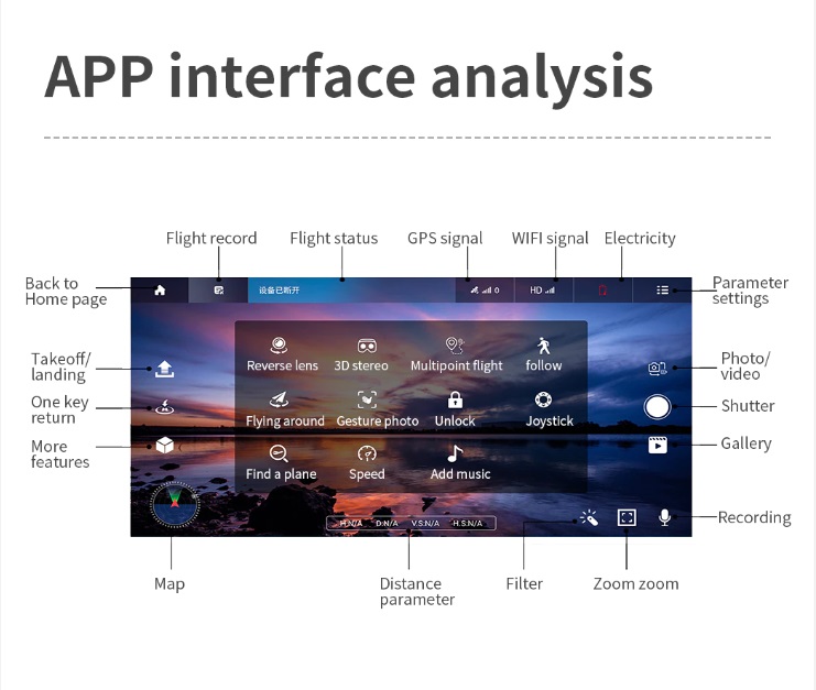 -- Three axis Electronic Stabilization gimbal -- EIS electronic image stabilization camera -- GPS/GLONASS double mode -- 1200 M remote control distance (Outdoor and unobstructed, depend on conditions and mobile device) -- 500 M HD image transmission distance (Outdoor and unobstructed, depend on conditions and mobile device) -- Real-time image transmission -- Intelligent follow -- Surround flight -- Waypoint flight -- Point of Interest -- Visiting Trace -- Image Scaling -- Folding portable fuselage -- One key return -- Video Editing -- Gesture control -- Brushless motor -- MV functions: filters, video effects, add background music, picture / video sharing